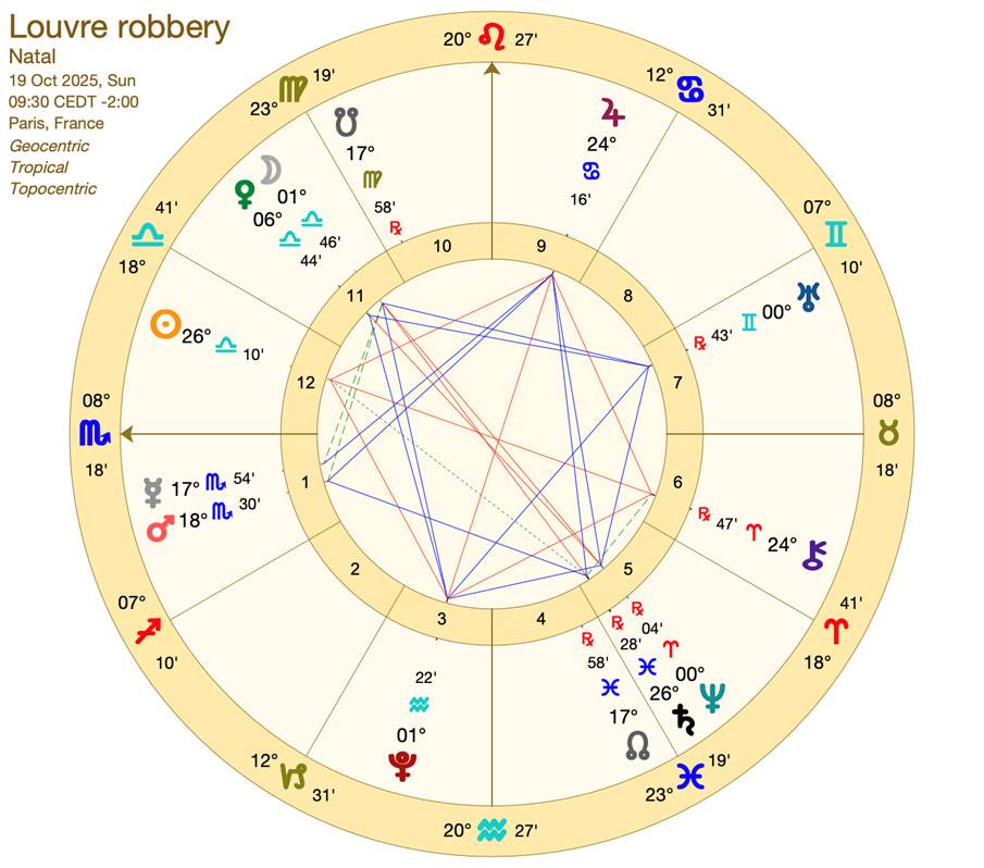 Yönetici Mars, Akrep burcunda ve 1. evde Merkür ile kavuşumda bulunuyor. Buradaki sembolizmi fark etmemek imkânsız. Akrep’in algısal, derin ve stratejik sularında yer alan çevik Merkür, keskin zekâsı ve stratejik aklıyla donanmış durumda. Ve evet, mit gerçek oluyor: Merkür, Aslan burcundaki Tepe Noktası (MC) ile kare açı yapıyor ve oda “Apollon’un Kadırgası” olarak adlandırılıyor. Apollon, Güneş’e atanmış, Aslan burcunun yöneticisi olan tanrıdır. Efsanede Hermes, Apollon’un sığırlarını çalar. Louvre’da ise Hermes, Apollon’un mücevherlerinden bazılarını alır. Ve tıpkı efsanede olduğu gibi, Hermes kendini masum bir bebek gibi gösterir; bu hırsızlar da tıpkı onun gibi (başkasıymış gibi) kendilerini inşaat işçileri olarak tanıtmışlar.