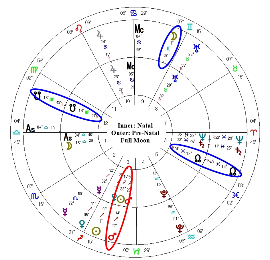 Ay düğümlerinin faktörünü düşündüğümüzde prenatal dönemde gerçekleşen Dolunay da özel bir önem kazanıyor. Prenatal Dolunay’ın 13 derece İkizler / Yay aksında gerçekleşmesi ve haritadaki Ay düğümlerine partil kare açı yapması, gelişim sürecinde belirleyici bir kırılma noktasına işaret ediyor. Düğümlerle kurulan sert açı nedeniyle kesintiye uğramış veya yarım kalmış bir süreci anlatabilir. İkizler–Yay aksı üzerinden çalışan göstergeler, periferik sinir sistemi ile spinal eksen arasındaki hassas dengeyi doğrudan etkilemiş görünüyor.