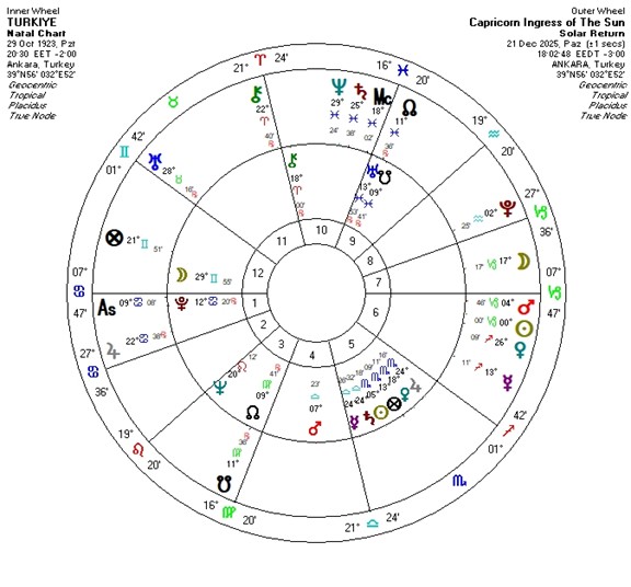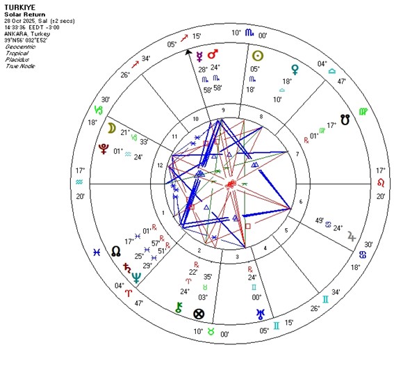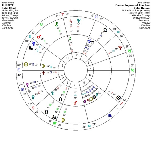 Türkiye için bu dönem halkın güvenlik ihtiyacının, aile yapısının ve barınma konusunun büyüyeceği bir zamana işaret etmektedir. Jüpiter burada halkın sesinin daha görünür olmasını, toplumun refah, korunma, sosyal destek ve sahiplenilme beklentisinin yükselmesine neden olabilir. 2. ev sınırına yakın duruşu, ekonomik konuların doğrudan halka yansıyacağını, “gelir–gider dengesi, beslenme barınma, temel yaşam kalitesi” başlıklarının öncelik kazanacağını göstermektedir. Bu yerleşim, sosyal destek paketleri, konut yardımları, aile temelli programlar, yerel üretim ve gıda güvenliği gibi alanlarda genişleme ve destek sinyali taşımaktadır. SR Jüpiter, Ülke haritasında 5. Evden (eşit ev sistemiyle değerlendirdiğimizde 4.evde olur) Merkür/ Satürn kavuşumuna kare açı yapmaktadır. Bu açı, piyasalarda zaman zaman aşırı bir iyimserlik dalgası yayılabileceğini zaman zaman da her şey daha kötüye gidiyor. duygusu verebileceğini düşündürmektedir. Gayrimenkul de devlet kaynaklı düzenlemeler, sınırlamalar olabileceğini düşündürmektedir. 2023 yılında başlatılmış olan Noter kanalıyla yapılan Tapu devirleriyle ilgili yeni düzenlemelerin olabileceğini düşündürüyor. Aynı zamanda piyasalar ve veriler arasında uyumsuzluk da söz konusu olabilir. İnşaatlar için ruhsat alma sıkıntıları da söz konusu olabilir. SR Jüpiter/ Natal Jüpiter üçgen açısı ise, eğlence ve tatil bölgelerinde hareketlilik yaşanmasına yardımcı olabilir. Bu bölgelerde yeni projeler başlayabileceği gibi yabancı yatırımcıların da ilgisini çekebilir. Aynı zamanda 5.ev komisyoncuları da temsil ettiği için, özellikle gayrimenkul danışmanları için daha hareketli bir seneye işaret etmektedir. SR Mars’ın da Natal Jüpiter’e kavuşum açısı ve SR Satürn’ün Üçgen açı ile vereceği destek ile, her ne kadar agresif ve rekabetçi bir piyasa olsa bile kalıcılık istikrar ve gerçekçi fiyatlarla ilgili olumlu bir süreç olabileceğini düşündürmektedir.2026 yılında özellikle emlakçılar için yaptırımlar, sıkı kurallar, denetlemeler yapılabileceğini, illegal veya kaçak çalışan emlakçıların takibe alınabileceğini düşündürmekte. Satış fiyatlandırmasında emlakçı ekspertiz raporlarının gerçeğe uygunluğunun esas alınması, gerçek dışı fiyatlandırmanın da cezai yaptırımlara uğrayabileceği gibi konuların gündemde olabileceğini düşündürmektedir. Devlet yönetimi, kurumlar ve ulusal vizyon alanında önemli bir yeniden yapılanma sürecinin devreye girebileceğini söyleyebiliriz. Satürn’ün Retro etkisi, geçmiş politikaların gözden geçirilmesi ve “ yarım kalan işlerin tamamlanması ” anlamına da gelmektedir. SR Ay Oğlak natal 7. Evden natal Venüs ve Jüpiter’e kare 7. ev konumu, uluslararası ilişkiler, diplomasi, ittifaklar ve anlaşmalar alanında duygusal hassasiyetleri artırır.