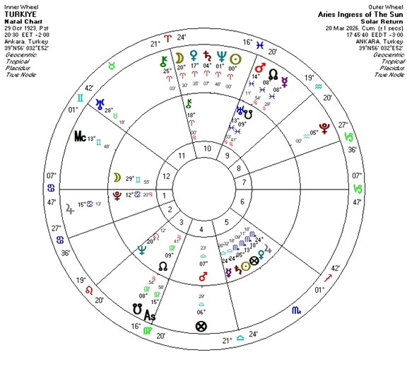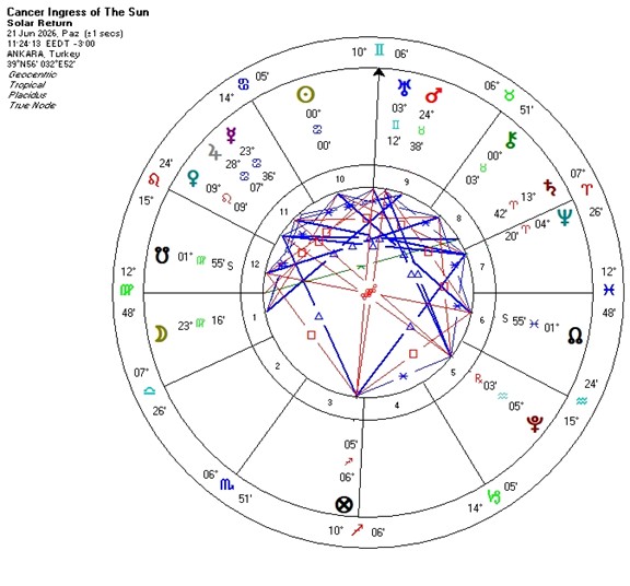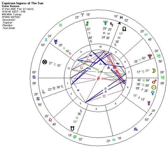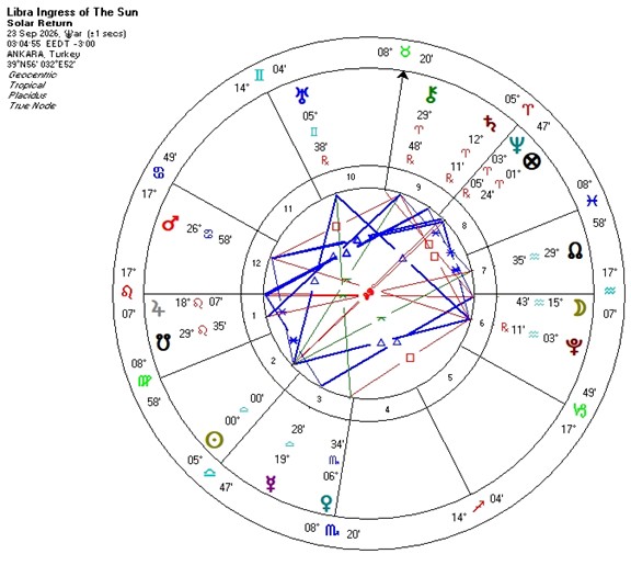 Bu dönem, halkın bazı kararlardan tatmin olmaması, daha fazla destek, daha fazla güvence talep etmesi, konut, kira, mülkiyet ve destek politikalarına dair beklentilerin yükselmesi söz konusu olabilir. Solar Return değerlendirmesinden sonra Güneş’in mevsimleri başlattığı İngress haritalarını Ankara koordinatlarına göre inceleyelim ve Ülkemiz haritasına etkilerine bakalım.